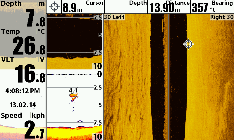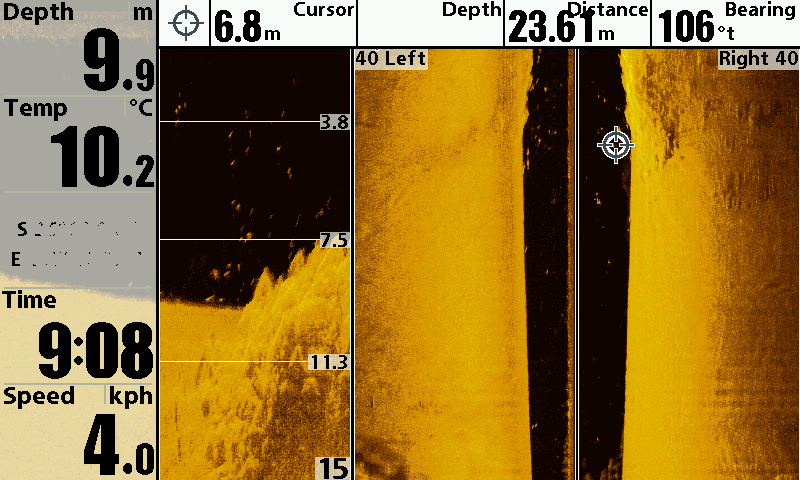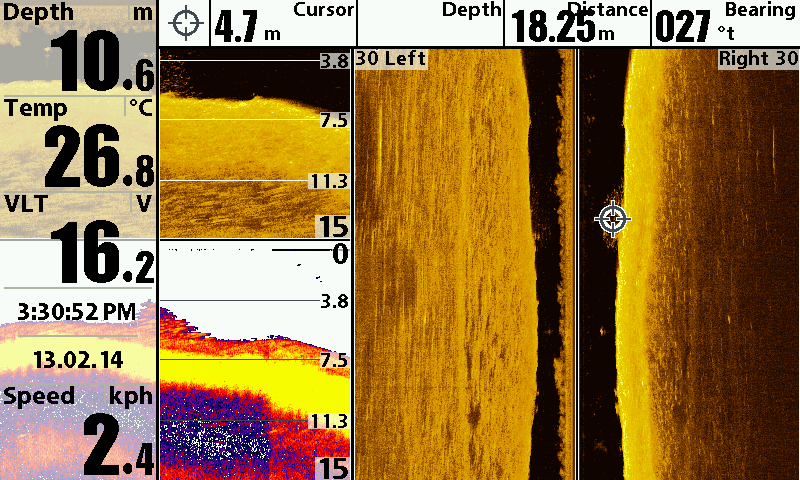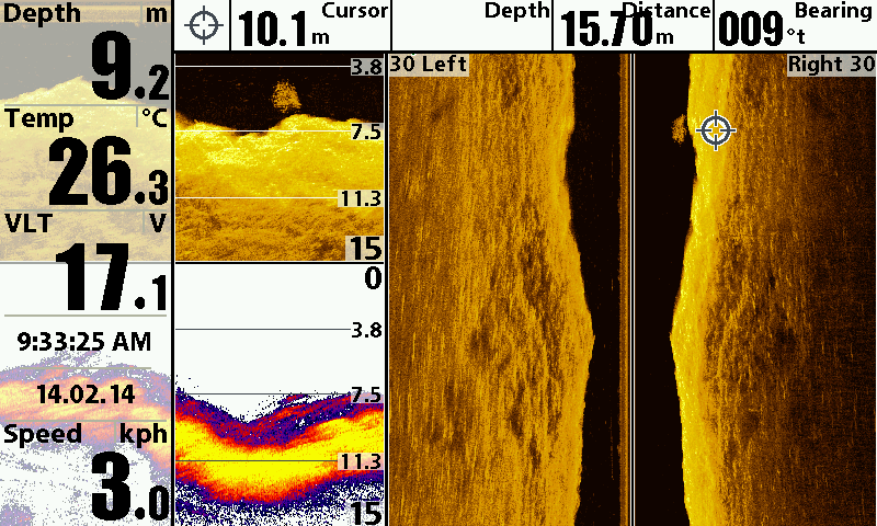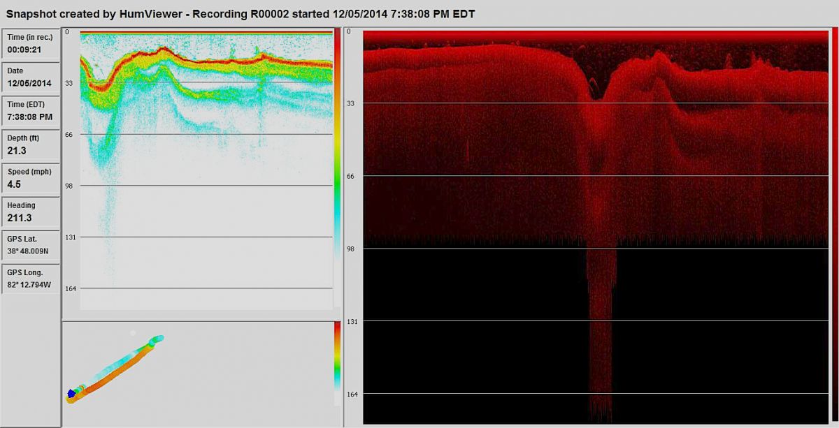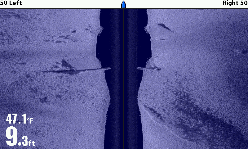 Second time out with side scan. Note skull return upper left. Reviewed on Humviewer and saw them. This was Monday 5-12-14