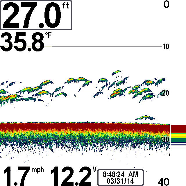 Here is a Switchfire screenshot of a giant school of 3 to 4 pound Coho Salmon from this spring - south end of Lake Michigan. We caught 38 fish that day. (we kept our limit for the grill but released the rest). Yes, fish are arches (with Fish ID off).