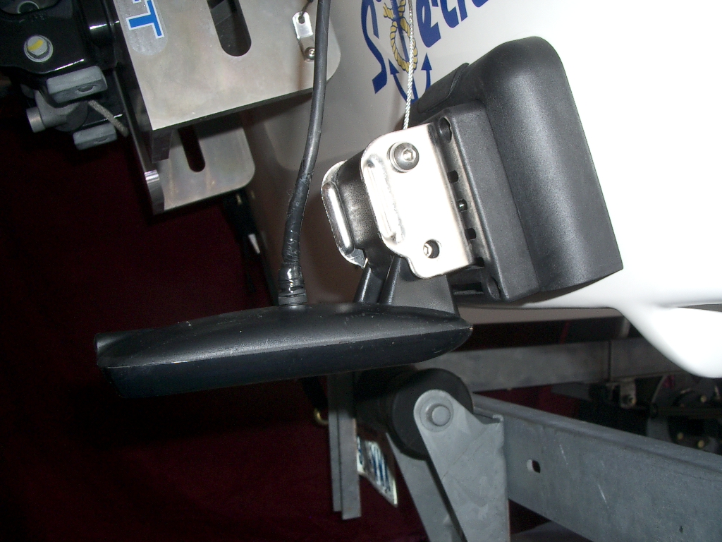 View from Starboard. The Hummingbird SI transducer is is mounted on SternMate™. Our boat is a 16 DLX Carolina Skiff. Each installation is unique to the boat, the equipment to be mounted and the boat-owner's preference. www.sternmate.com