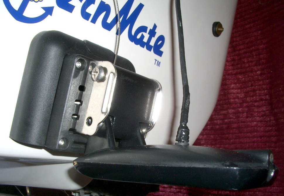 View from port. Hummingbird SI transducer is mounted on a SternMate™ transducer mounting system. The system is installed using a proprietary high speed adhesive without the necessity of damaging screw holes. The boat is our 16DLX Carolina Skiff. Boaters worldwide are now mounting their transom-mounted transducer sounding equipment professionally without compromise to their boat hull. www.sternmate.com