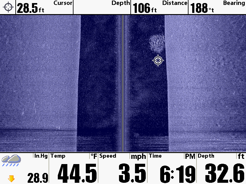 SI Settings Sensitivity: Auto Contrast: 14 Sharpness: Low Range: 125 feet both sides Speed and depth shown in shap shoot
