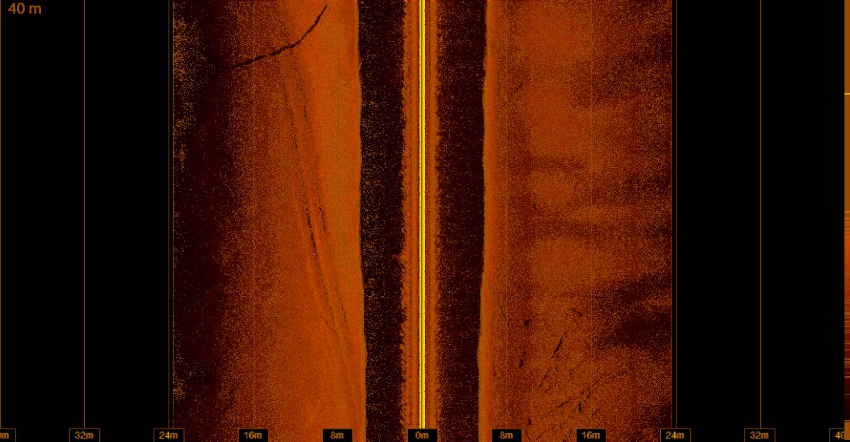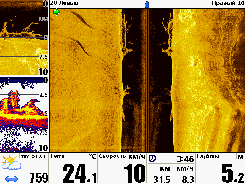 Split 2D sonar and down image view of school of baitfish and tree laying on bottom in 73' of water