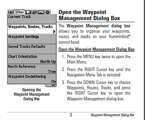 Page 3 of the WMG shows how to access the Waypoints, Routes and Tracks option from the Nav Menu