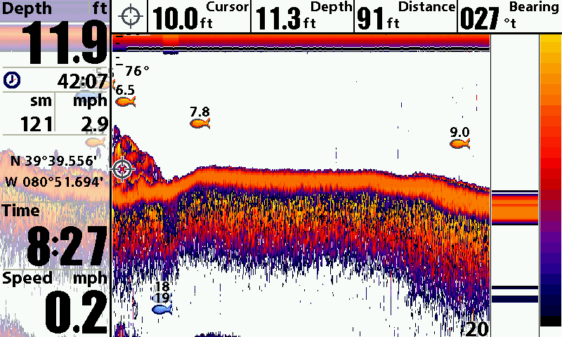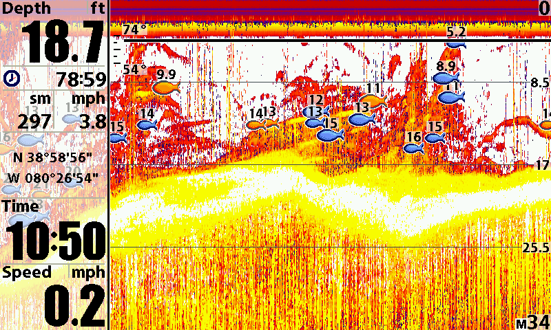 Split 2D sonar and down image view of school of baitfish and tree laying on bottom in 73' of water