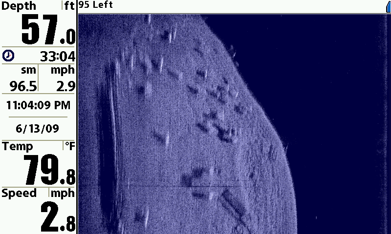 This is an old barge sunken near a dock from where telephone poles were once shipped. Scanned with an "EdgeTech 4125-D"