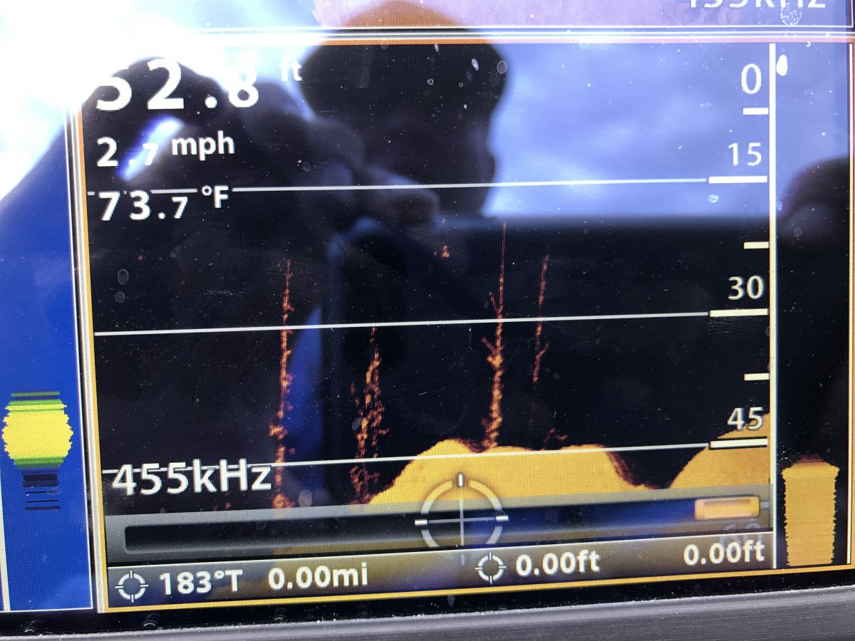 Rare image of Wels catfish. This species is most of the time resting in some structure and is impossible to find on fish finder. Only lucky crossing of its path, while it is hunting, make this picture possible.